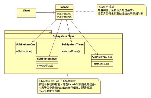 外观模式(facade),为子系统中的一组接口提供一个一致的界面,此模式定义 一个高层接口,这个接口使得这一子系统更加容易使用。