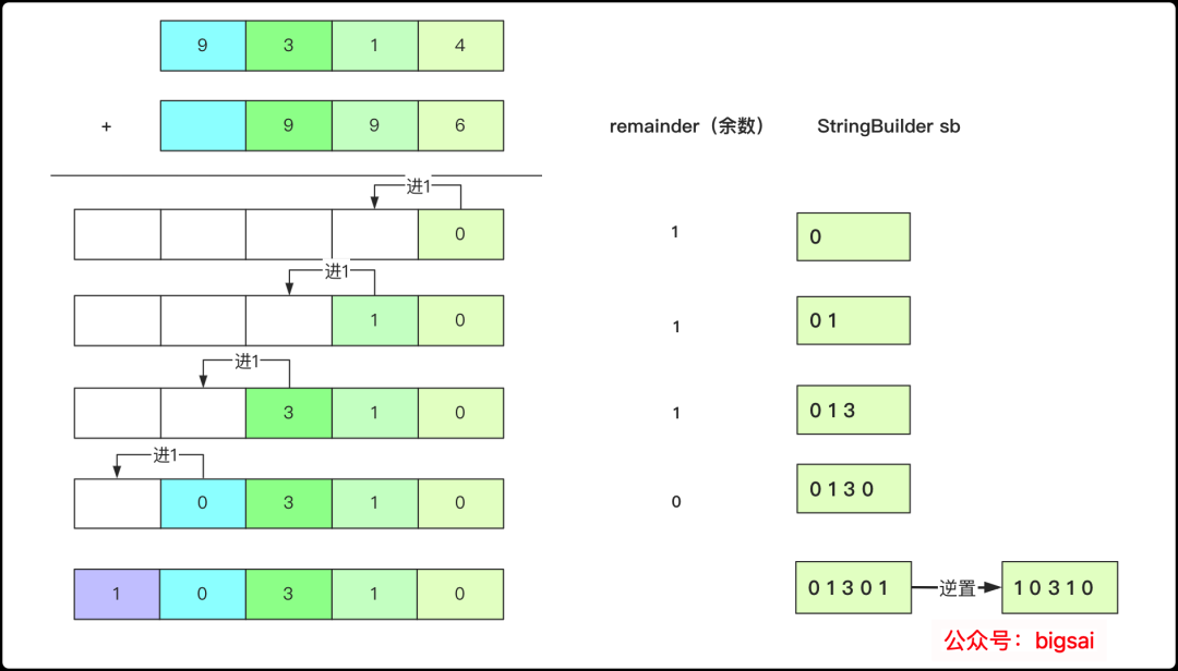 2、从右往左进行计算,可以将结果放到一个数组中最后组成字符串,也可以使用StringBuider拼接,拼接的时候最后要逆置一下顺序。