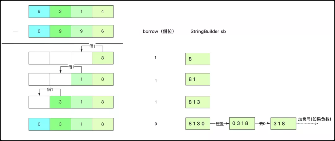 5、每个位置正常进行减法运算,如果值小于0,那么就需要向上借位(+10),那么处理上一位进行减法时候还要将借位的处理一下。