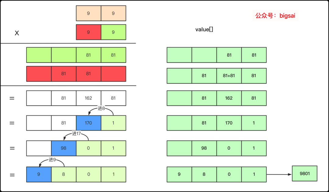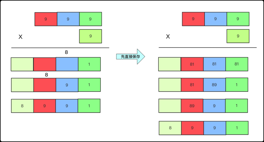 但是也可以先直接用int类型数组存储各位的乘积然后从右向左进行进位,如下图所示。