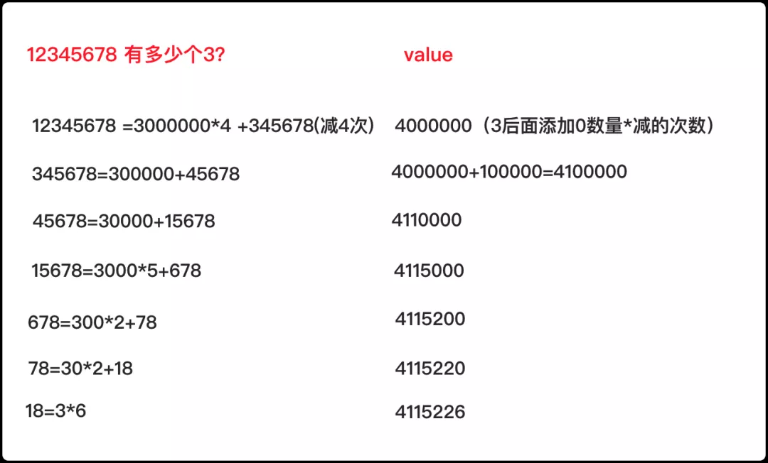 那就要加速寻找次数,减少这个减法的次数了,减法次数减小的一个最好方案就是能不能扩大除数b。如果b后面加个'0',那么算出来的结果就乘以10,减法的次数变成原来十分之一。根据这个思想我们可以一直每次找到b的最大10的倍数(小于a)计算减的次数再换算成减b的总词数,将结果要以字符串方式保留,后面一直迭代到最后为止,这虽然是一道除法运算的题,但是也蕴含减法和加法(次数叠加到结果中)。