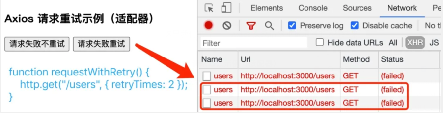 这里我们来看一下 Axios 实现请求重试示例的运行结果: