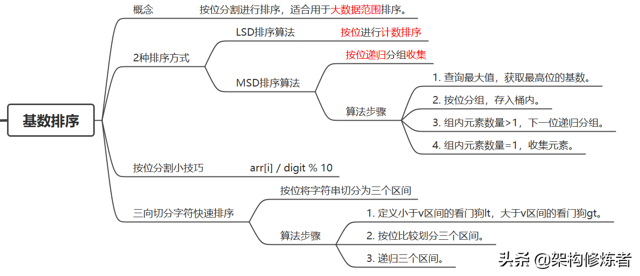 基数排序是非比较型整数排序算法,其原理是将整数按位分割进行排序。基数排序适用于大范围数据排序,打破了计数排序的限制。由于整数也可以表达字符串(比如名字或日期)和特定格式的浮点数,所以基数排序也不是只能使用于整数。