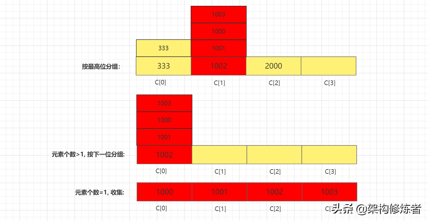 - 组内元素数量=1,收集元素。sortArr[index++] = groupBucket[i][0];
