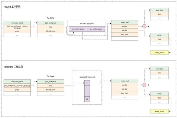 - bound:绑定处理器的工作队列,每个 worker 创建的内核线程绑定到特定的 CPU 上运行。