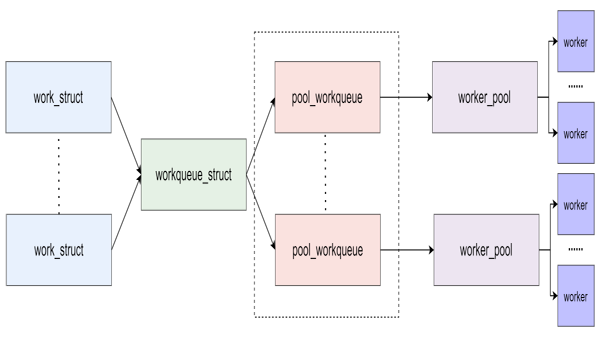 关于 workqueue 中几个概念都是 work 相关的数据结构非常容易混淆,大概可以这样来理解: