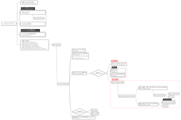 经过上面两个阶段的初始化,workqueue 子系统基本就已经将数据结构的关联建立好了,当有 work 来进行调度的时候,就可以进行处理了。