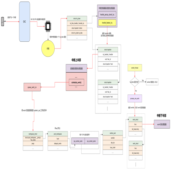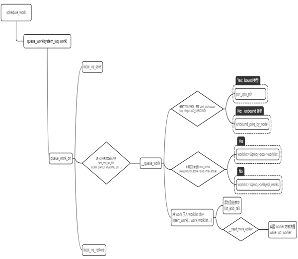 当驱动程序在进程上下文中有异步执行的工作任务时,可以用 work 来描述工作任务。把 work 添加到一个链表 worklist 中,然后由一个内核线程 worker 遍历链表,串行地执行挂入 worklist 中的所有 work。如果 worklist 中没有 work,那么内核线程 worker 就会变成 IDLE 状态;如果有 work,则执行 work 中的回调函数。