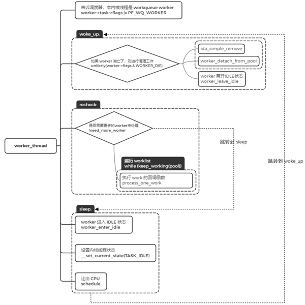 - woke_up 中,如果此时 worker 是需要销毁的,那就进行清理工作并返回。否则,离开 IDLE 状态,并进入 recheck 模块执行。
