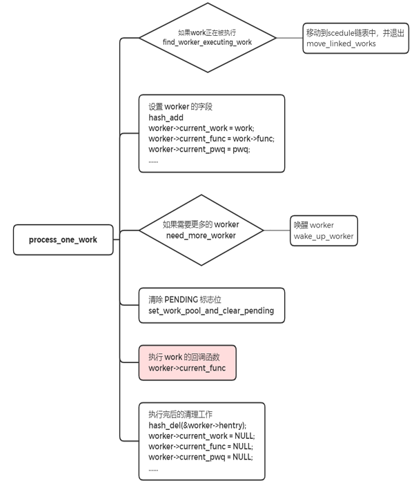 - recheck 中,判断是否需要更多的 worker 来处理,如果没有任务处理,跳转到 sleep 地方进行睡眠。如果有任务需要处理时,遍历工作链表,对链表中的每个节点调用 process_one_work 来执行 work 的回调函数,即 INIT_WORK 里的回调函数。