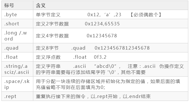 数据定义伪操作一般用于为特定的数据分配存储单元,同时可完成已分配存储单元的初始化。常见的数据定义伪操作有如下几种: