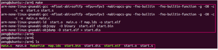 - 通过ld命令将main.o、start.o链接生成start.elf,-Ttext 0x40008000表示设置代码段起始地址为0x40008000