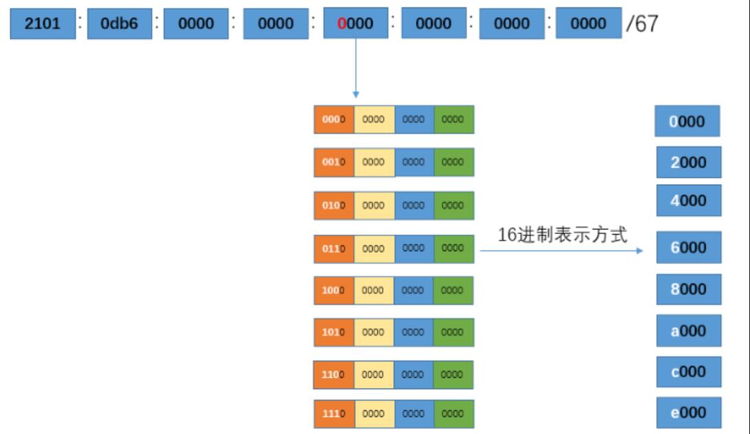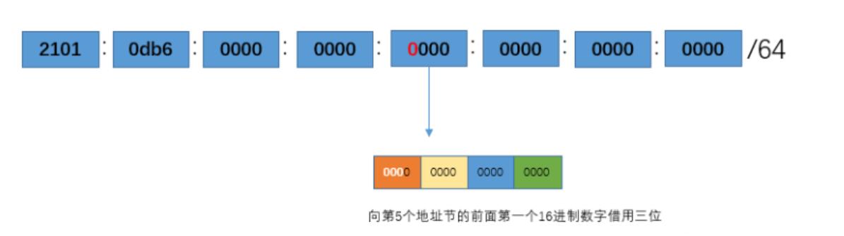 首先我们要知道IPv6 地址位有128位,一个IPv6由8个地址节组成,每个地址节为16位,所以2101:db6::/64 完整的16进制表达方式及二进制方式如下图