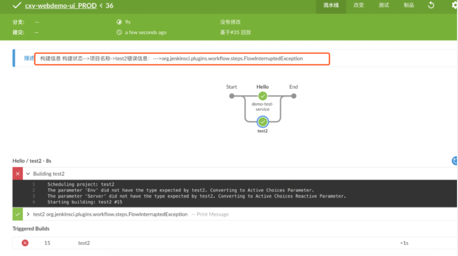 首先我们用静态数据来存储要发布的项目名称存储为一个List,定义一个Map用来存储并行任务。定义buildStatus展示项目错误信息(这里做了信息格式化)。使用build进行项目触发。这里会把每个失败的任务存储展示到流水线日志中。