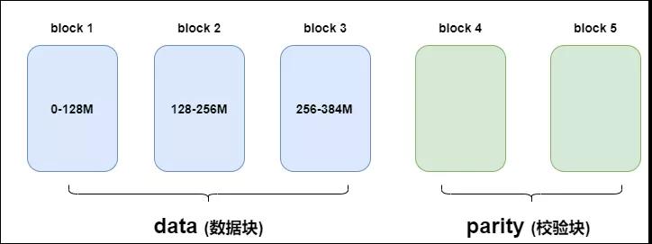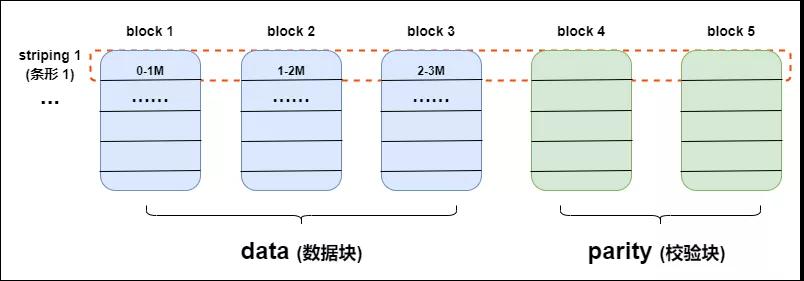 传统模式下 HDFS 中文件的基本构成单位是block,而EC模式下文件的基本构成单位是block group。以RS(3,2)为例,每个block group包含3个数据块,2个校验块。