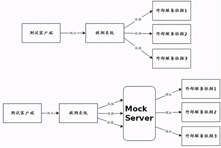 做过接口测试的同学一定听说过mock Server,大家会觉得其很神秘,很高大上!mock Server出现的原因是现今的业务系统很少有孤立存在的,它们或多或少需要使用兄弟团队或是其他公司提供的服务,这给我们的联调和测试造成了麻烦。于是就有了解决方案——搭建一个临时的server,模拟那些服务,提供数据进行联调和测试。下图很好的解释了什么是Mock server