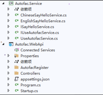 注意: 如果需要注入的服务没有 IXXXService的接口 ,那么 builder.RegisterAssemblyTypes 就只需要传一个程序集。如果服务与接口同在一个项目,那也是要传两个程序集的。