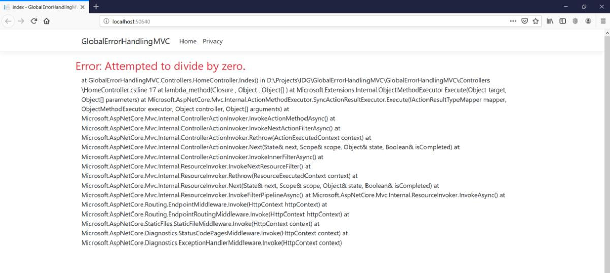 可以着重看一下上面的 app.UseExceptionHandler("/Error"); ,这里的 UseExceptionHandler 实现了 pipeline 注册,一旦应用程序出现了未处理异常,那么会自动将 用户 导向 /Error 页面。