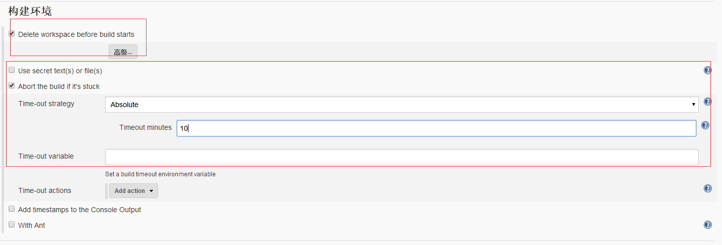 勾上 Abort the build if it's stuck 是设定构建的超时时间,如果构建使用的时间超过设定的时间,那么就认为这次的构建是失败的。笔者这里超时设置的是10分钟