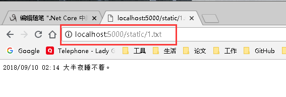 在wwwroot文件夹下放一个名称为1.txt的测试文本,然后通过地址访问。