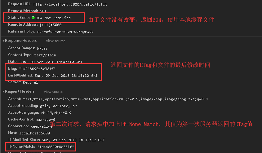 在了解静态文件中间件前,还需要了解HTTP中关于静态文件缓存的机制。跟静态文件相关的HTTP头部主要有Etag和If-None-Match。