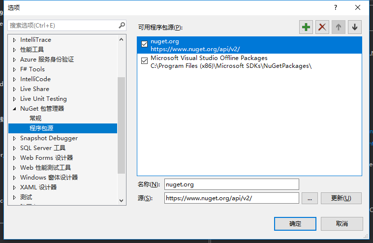 这里提醒一下,有些同学的系统可能添加Nuget程序包时,发现无法找到程序包。我们这里找出了解决方法,点击Nuget程序包添加页面的右上角设置按钮,看到如下页面,手动添加如下的nuget.org,然后重新搜索即可。