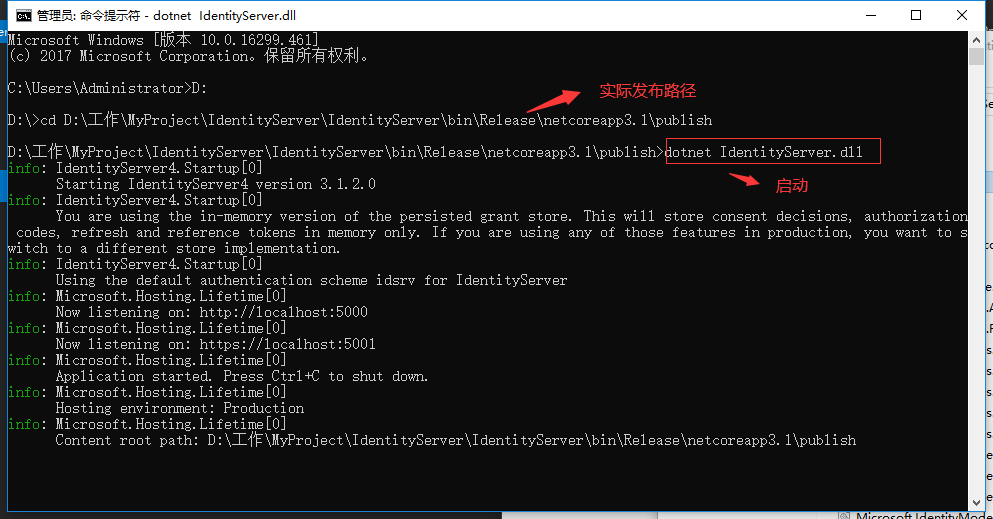 发布完成后,我们会在发布路径中看到程序dll.我们找到发布路径,通过CMD命令窗口:dotnet xxx.dll可直接启动。