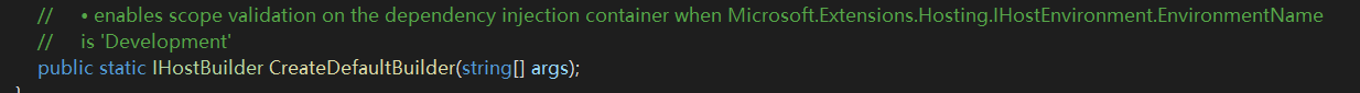 为什么危险?到底什么是root provider?那就要从原生DI的生命周期说起。我们知道,DI容器被封装成一个IServiceProvider对象,服务都是从这里来获取。不过这并不是一个单一对象,它是具有层级结构的,最顶层的即前面提到的root provider,可以理解为仅属于系统层面的DI控制中心。在Asp.Net Core中,内置的DI有3种服务模式,分别是Singleton、Transient、Scoped,Singleton服务实例是保存在root provider中的,所以它才能做到全局单例。相对应的Scoped,是保存在某一个provider中的,它能保证在这个provider中是单例的,而Transient服务则是随时需要随时创建,用完就丢弃。由此可知,除非是在root provider中获取一个单例服务,否则必须要指定一个服务范围(Scope),这个验证是通过ServiceProviderOptions的ValidateScopes来控制的。默认情况下,Asp.Net Core框架在创建HostBuilder的时候会判定当前是否开发环境,在开发环境下会开启这个验证: