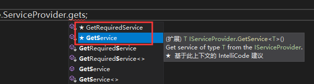 通过代码提示可以看到,IServiceProvider提供了2种获取service的方式: