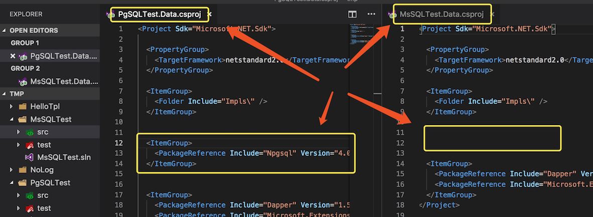 下面分别创建一个MsSQL和PgSQL的项目,用来对比和验证。