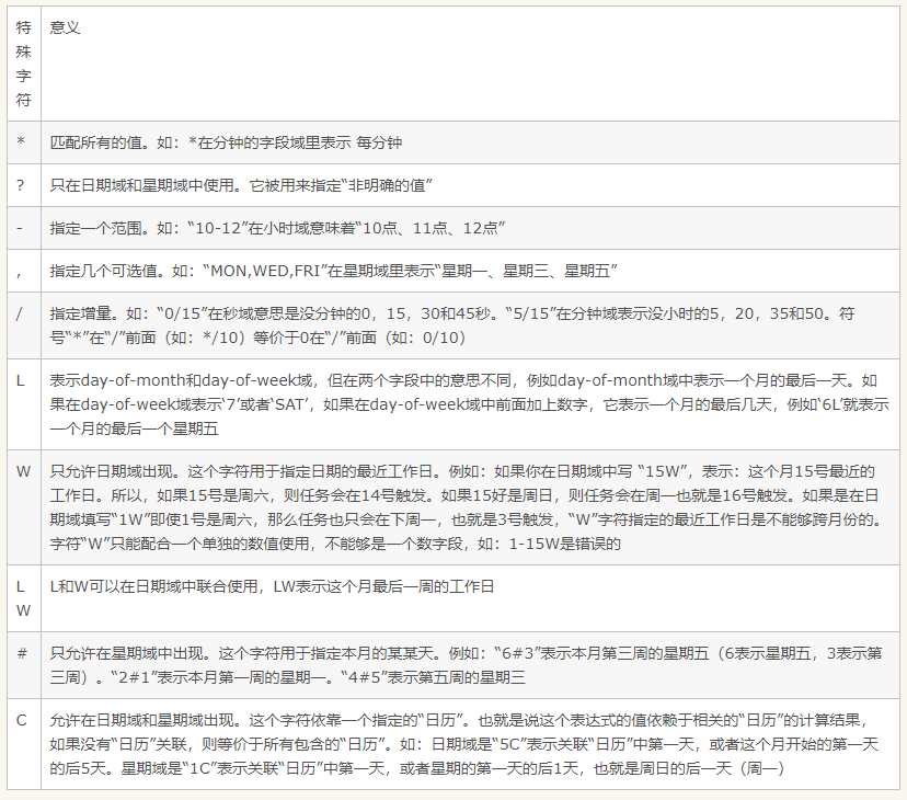 CronTrigger:Cron表达式包含7个字段,秒 分 时 月内日期 月 周内日期 年(可选)。