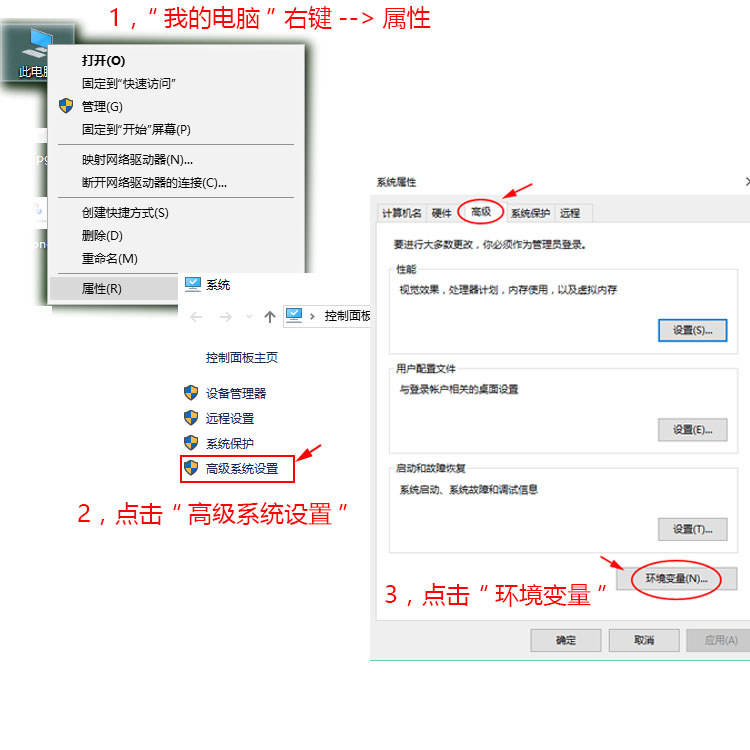 “我的电脑”右键 –> 弹出系统对话框 点击“高级系统设置”–> 弹出系统属性对话框 点击 “环境变量”