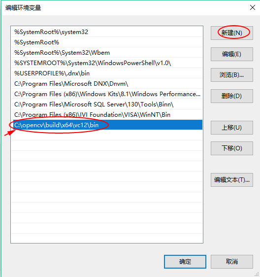在弹出的编辑对话框中 点击 新建 ,把OpenCV的bin目录路径添加上去