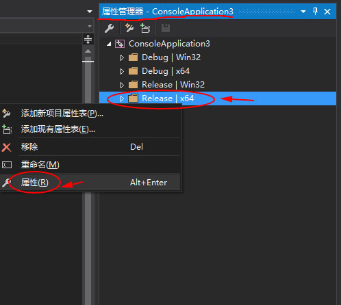 在”属性管理器中“–>选择 “Release| x64” 点击右键 –> 选择“属性”
