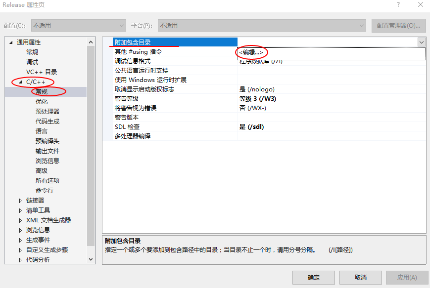 1,设置 C/C++ –> 常规 –> 附加包含目录,点击编辑进行设置