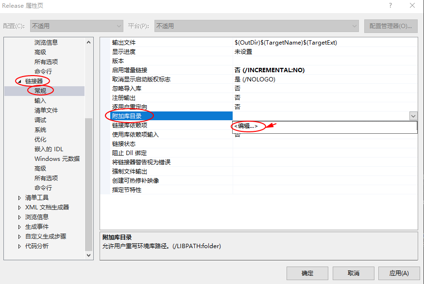 2,设置 链接器 –> 常规 –> 附加库目录,点击编辑进行设置