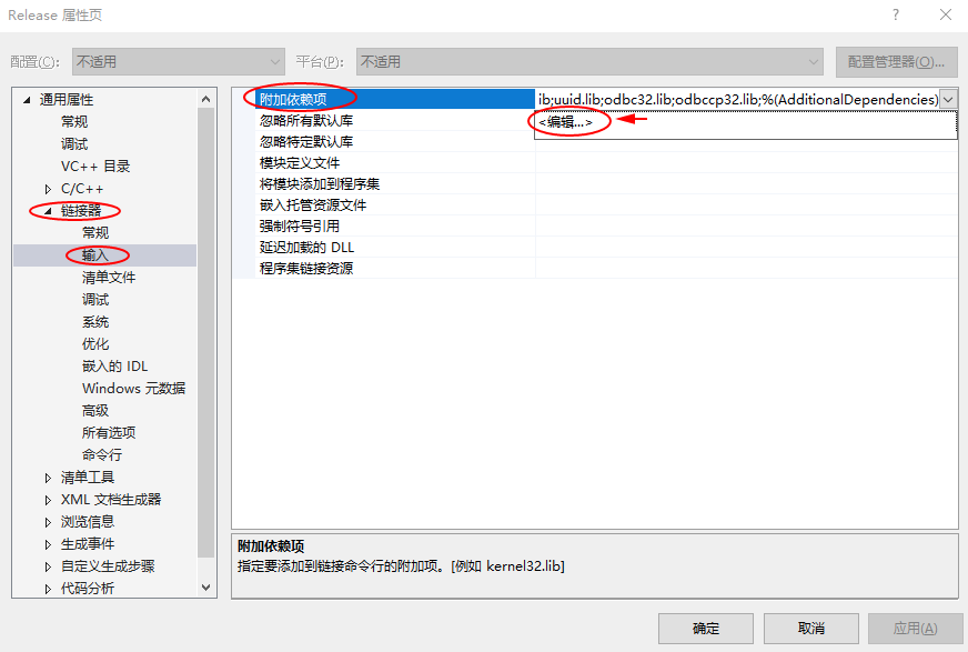 3,设置 链接器 –> 输入–> 附加依赖项 ,点击编辑进行设置