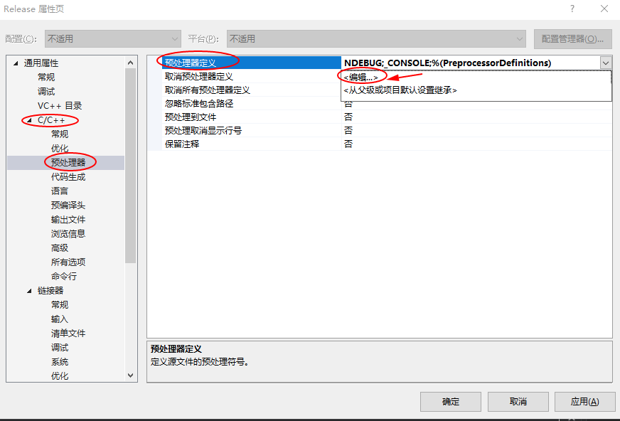 4,设置 C/C++ –> 预处理器 –>预处理器定义 ,点击编辑进行设置
