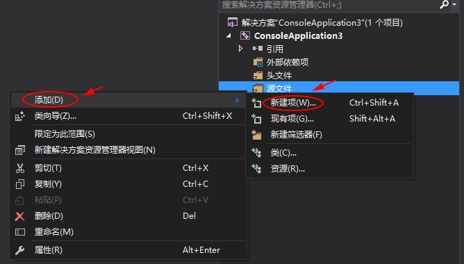 在“源文件”文件夹,点击右键,弹出选择"添加"–> “新建项”