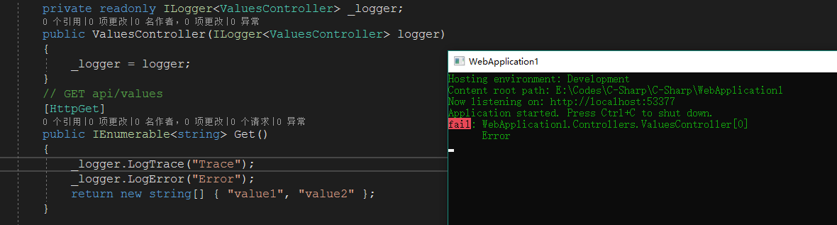在.Net Core中使用模板新建的Web Api项目时,会自动加入日志功能。只需要在控制器中注入ILogger就可以了。命名空间为:Microsoft.Extensions.Logging