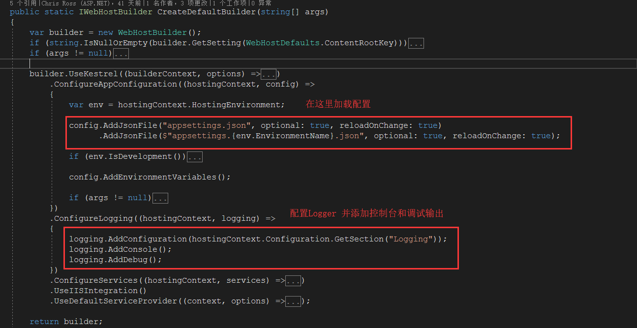 这里说明一下到底是在什么时候,读取了appsettings.json中的配置了了? 其实是在Program中 WebHost.CreateDefaultBuilder(arge)