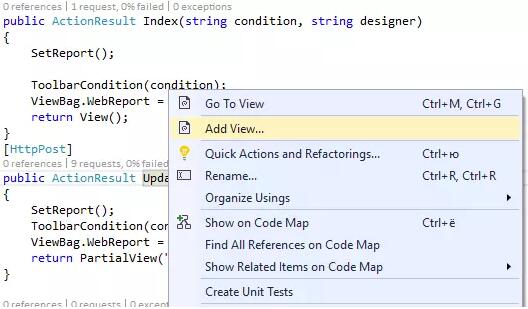 在Index方法中,我们传递条件参数 – 视图中复选框的状态。此外,它还添加了一个调用ToolbarCondition方法(条件)。它将处理参数并启用或禁用报表工具栏。我们来写这个方法: