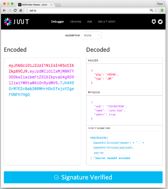 如果您想使用JWT并将这些概念付诸实践,您可以使用jwt.io Debugger来解码,验证和生成JWT。