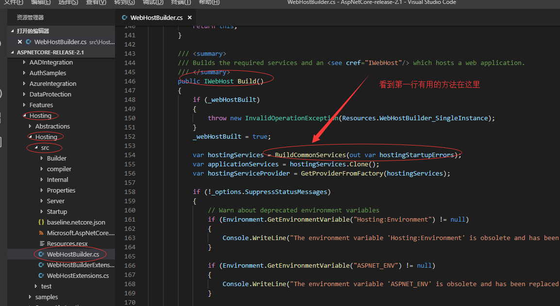1.首先到aspnetcore的github开源地址https://github.com/aspnet/AspNetCore/tree/release/2.1 上去下载源码(我们使用的是2.1)。然后使用vscode打开解压后的文件夹。至于vscode如何加载文件,你可以看我这篇文章使用Visual Studio Code开发.NET Core看这篇就够了 。