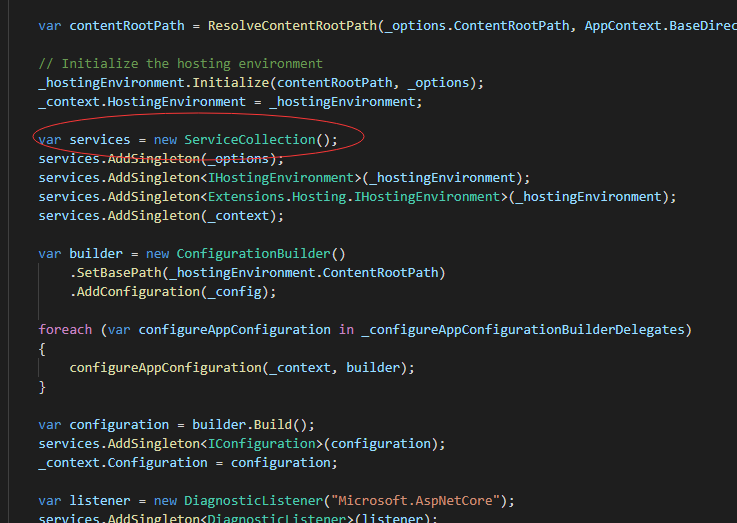 可以看到,var services = new ServiceCollection();首先new一个ServiceCollection然后往services里面注入很多内容,比如:WebHostOptions ,IHostingEnvironment ,IHttpContextFactory ,IMiddlewareFactory 等等(其实这里已经设计到依赖注入的概念了,先思考下吧),然后我们在后续就可以使用了!最后这个BuildCommonServices就返回了这个services对象。