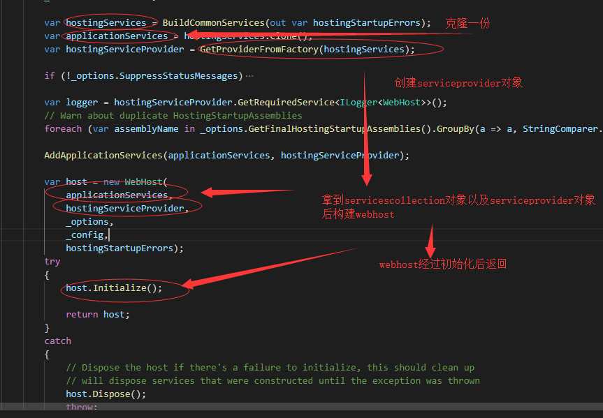 5.我们再回到build方法拿到了BuildCommonServices方法构建的ServiceCollection实例后,通过GetProviderFromFactory(hostingServices) 方法构造出了IServiceProvider 对象。到目前为止,IServiceCollection和IServiceProvider都拿到了。然后根据IServiceCollection和IServiceProvider对象构建WebHost对象。构造了WebHost实例还不能直接返回,还需要通过Initialize对WebHost实例进行初始化操作。那我们看看在初始化函数Initialize中,都做了什么事情吧。