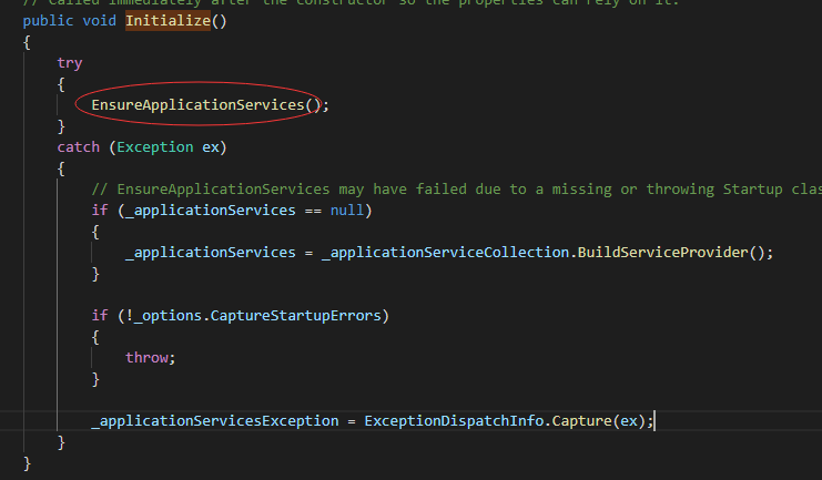 6.这里我们把代码导航到src/Hosting/Hosting/src/Internal/WebHost.cs找到Initialize方法。如下图所示:主要就是一个EnsureApplicationServices 方法。