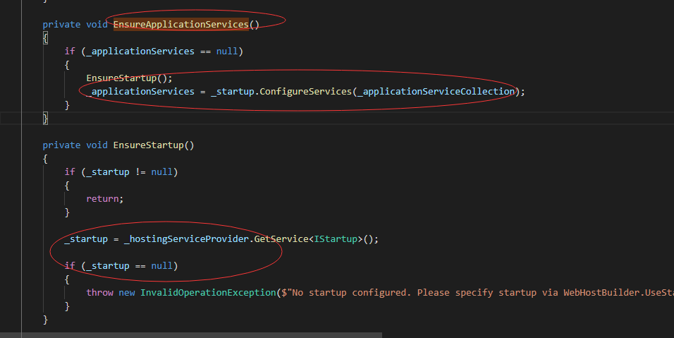 7.我们继续导航查看这个方法的内容如下:就是拿到Startup 对象,然后把_applicationServiceCollection 中的对象注入进去。