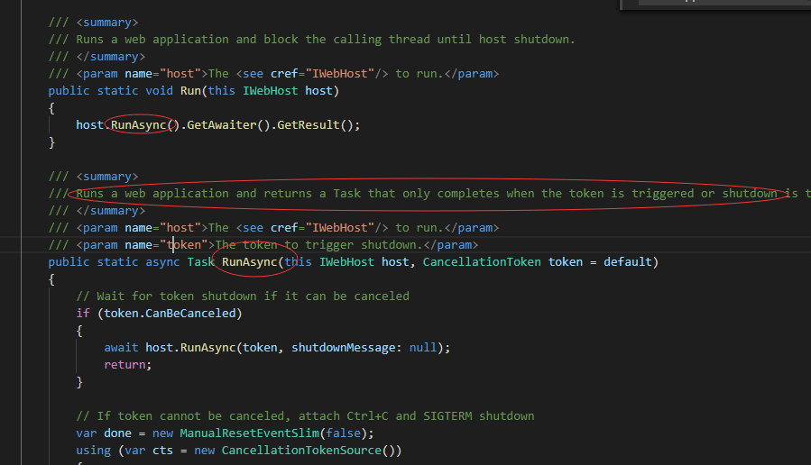 WebHost执行RunAsync运行web应用程序并返回一个只有在触发或关闭令牌时才完成的任务(这里又涉及到异步编程的知识了,咱们以后再详细讲解) 。这就是我们运行ASP.Net Core程序的时候,看到的那个命令行窗口了,如果不关闭窗口或者按Ctrl+C的话是无法结束的。