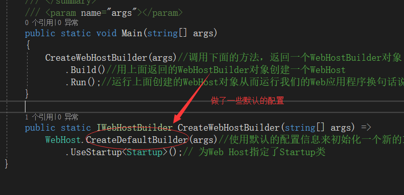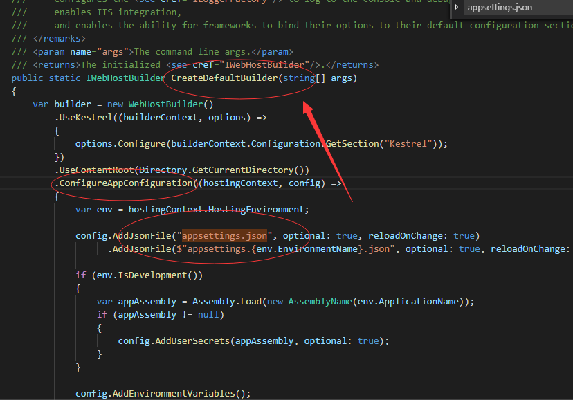 8.我们回过头来看我们的Main方法,发现里面有一个CreateDefaultBuilder方法,就是这个方法里面为我们做了一些默认的设置,然后加载我们的配置文件的!